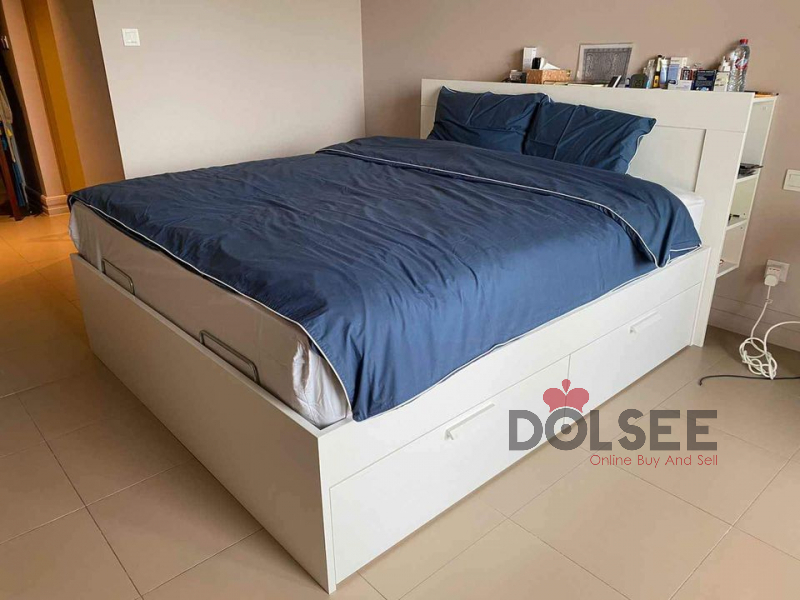 Ikea brimnes double size bed 140x200cm and under four drawers storage boxes headboard has storage space available with ikea mattress Hamarvik springs 140x200cm