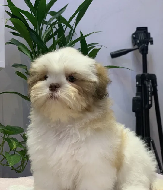 شدزو بلون مميز مع ليفر نوس Shihtzu Top Quality Puppy Male White & Brown Panda Color With Liver Nose & Olive Eye Color
