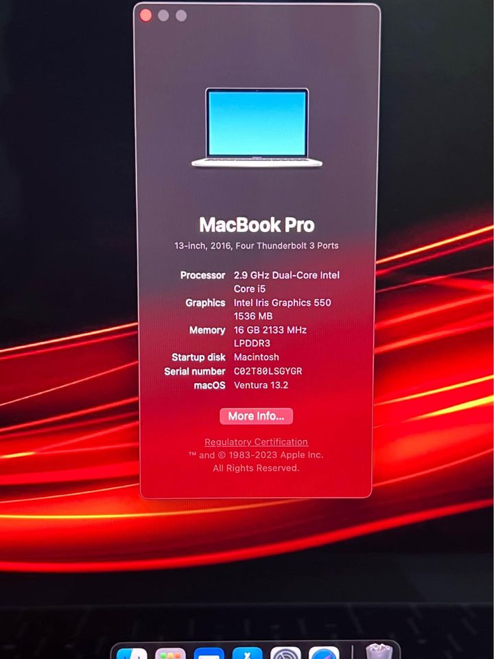MacBook Pro (13-inch, 2016, Four Thunderbolt 3 Ports) Touch Bar fingerprint macOS Ventura Version 13.2Processor 2.9 GHz Dual-Core Intel Core i5Memory 16 GB 2133 MHz LPDDR3Storage Capacity 256 gb Battery Cycle Count 659Condition Attache picGraphics Intel Iris Graphics 550 1536 MBLaptop And First Class ChargerSameer Khan