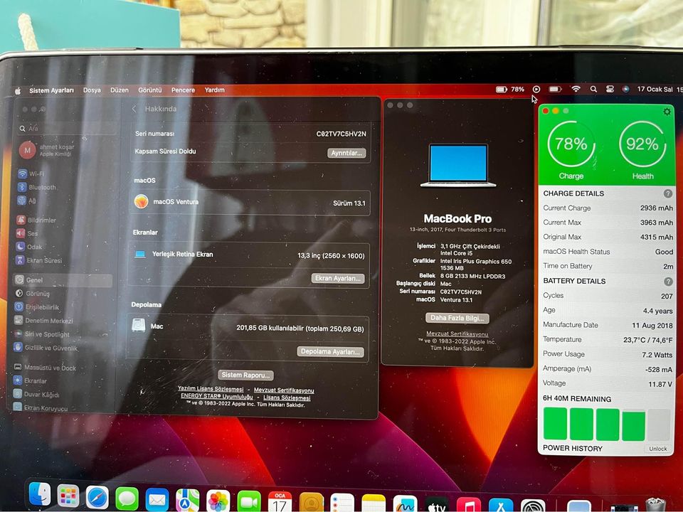 No tradesMacBook Pro 13-inch,2017 TWO THUNDERBOLT 3 PORTSProcessor: 3.1 GHz intel core i5 quad coreRAM: 8GB 2133 MHzSSD : 256 GBDisplay 2560x1600 4k retinaMy device is in zero condition, no hardware or software problems.It is the original Turkish device. Purchased in 2017. Box, invoice and box contents are complete (even the gelatin of the box is on top of it)It has an original Turkish keyboard, no problems.Touchbar works smoothly no problem when you touch it all functions workBattery is 92% healthy at 207 cycles (you can confirm from the photo)The speaker does not squeakLatest version macOS Ventura installedI can help with any questions you may have. I'll reply to your texts quicklyNo tradesAhmet Koşar
