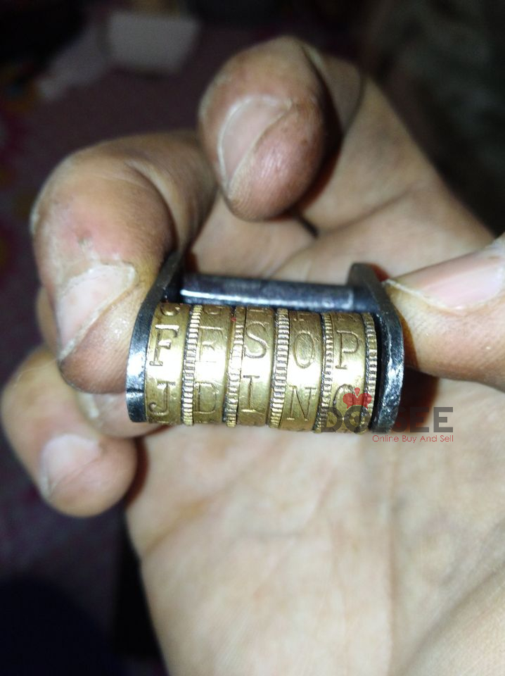 قفل انتيك قديم جدا نادر تلاقيه A highly collectable vintage lock with a 5 letter word combinationIron case with brass wheelsApproximately:28.4mm wide x 34.5mm tall x 13mm wide29g in weightThe 5 brass wheels each have 7 lettersThe correct combination aligns between the two lines on the baseGeneral usage wear, knocks, dings and marksClean - No rust