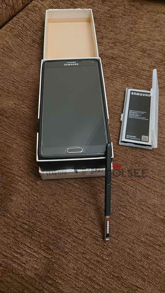 موبايل سامسونج نوت ٤ . مستعمل بحالة ممتازة اسود اللون وارد دبي بالعلبة ومعه بطارية زيادة مستعملة . الموبايل به سكرين سيفر وكفر من الخلف