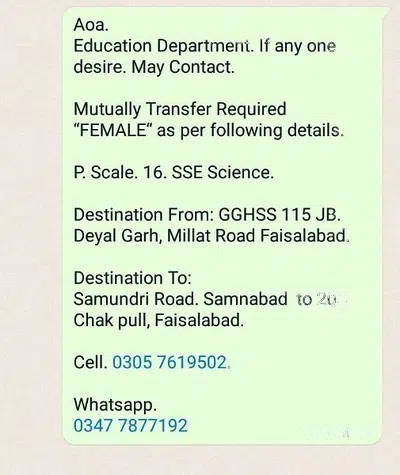 Destination From: GGHSS 115 JB. Deyal Garh, Millat Road Faisalabad.