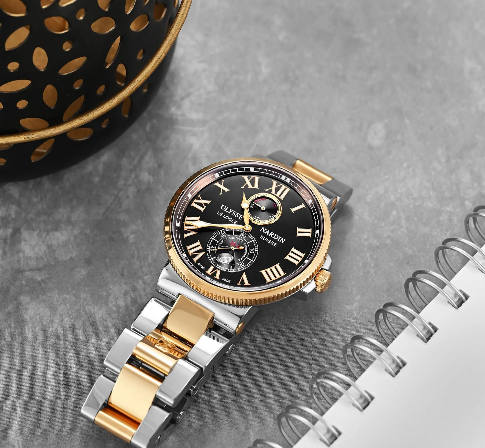 علبة مصقولة من الفولاذ المقاوم للصدأ ، حلقة ثابتة من الذهب الوردي مع حافة مدببة قليلاً ، واقي تاج مصقول من الفولاذ المقاوم للصدأ ، تاج ذهبي وردي مع حلقة مطاطية ممزقة لإمساك آمن ، حزام مطاطي بني مع عنصر واحد من التيتانيوم المصقول مع نقش Ulysse Nardin شعار.