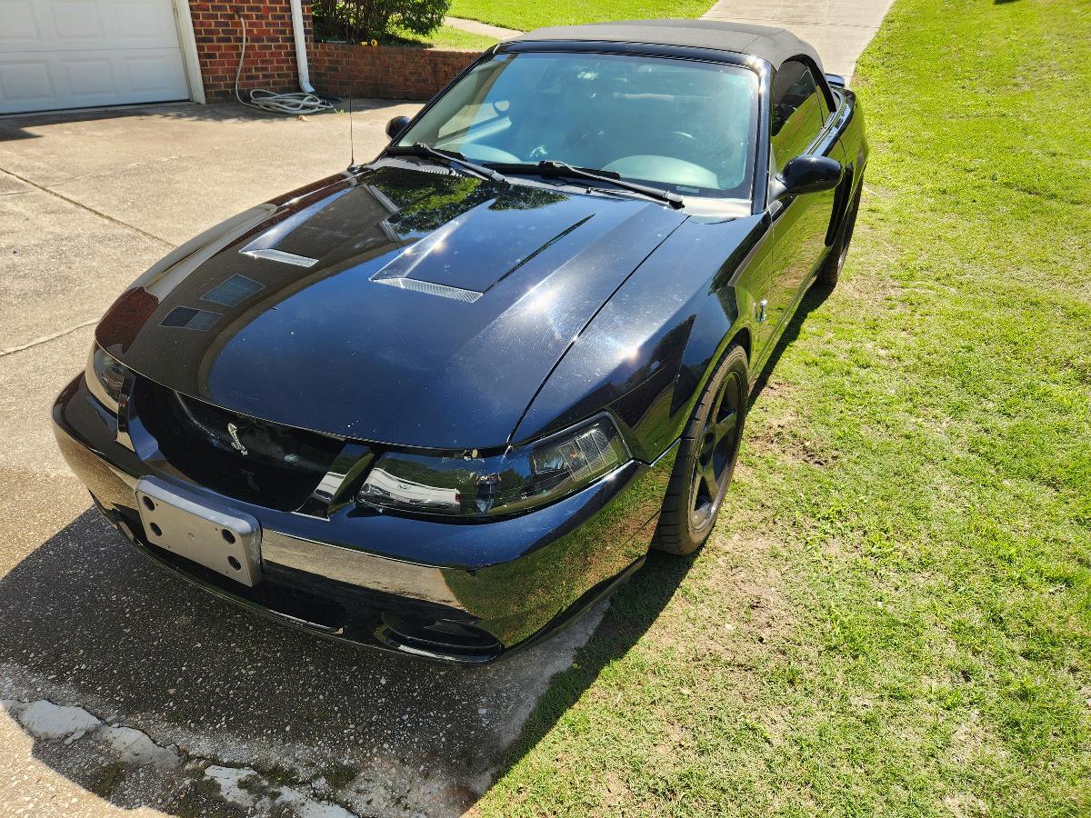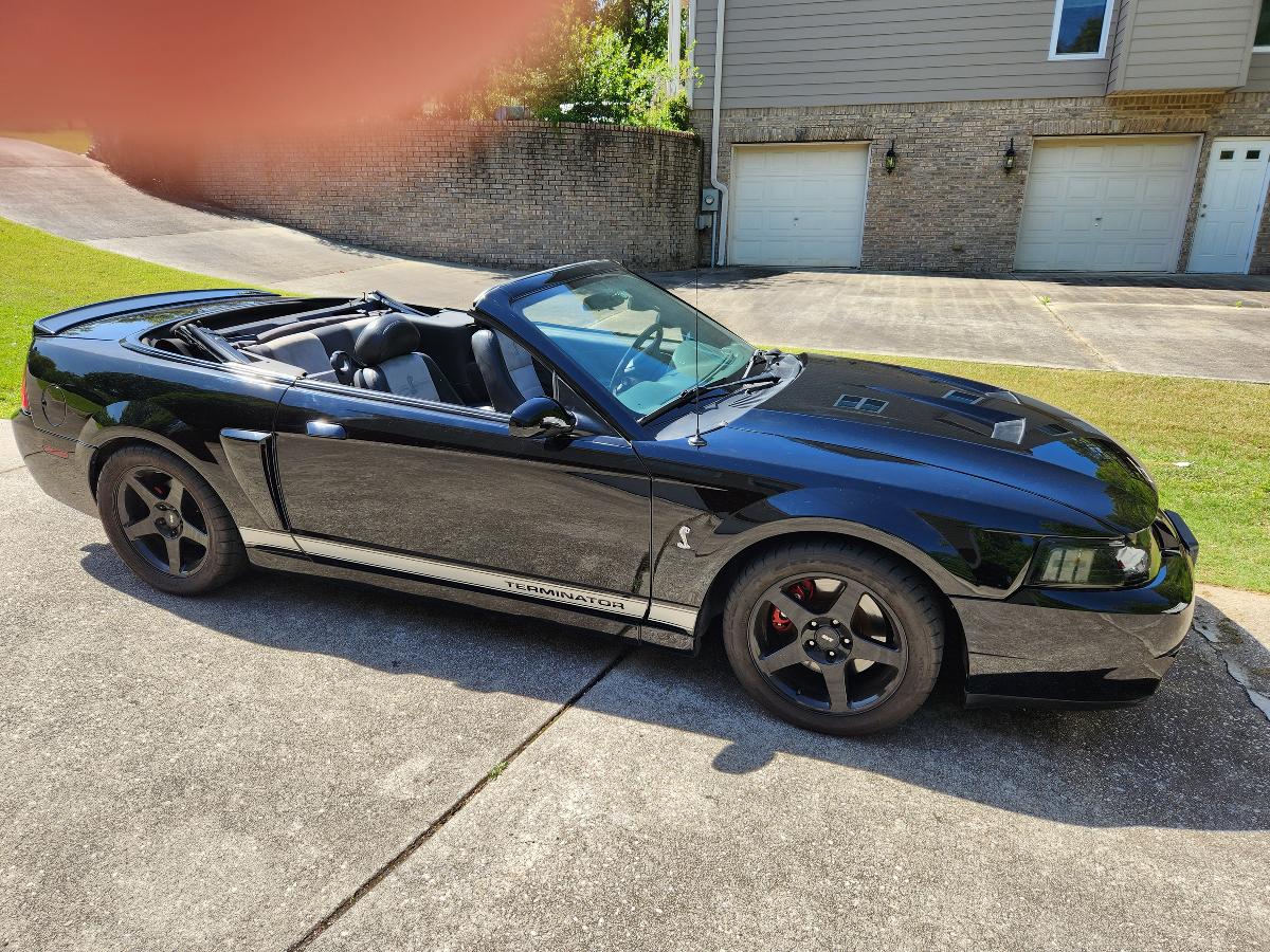 3 Triple Black Terminator Cobra Convertible.  82K miles.  $23995.  Everything Works.  Newer roof, roof struts and front & rear suede seat inserts.   Aftermarket Pioneer sound system.  A pillar gauge set.  Modified engine with overdriven Ford Racing 2.3L Whipple Supercharger 18 PSI, 9:1 forged pistons, new head & valve cover gaskets, timing chain guides & chains, Diablo MAF sensor, MHD ignition, tuned to 633 HP/ 591TQ RW on DynoJet (est. 865 crank HP).  Upgraded T6 trans, adjustable front suspension, BBK headers & Magnaflow exhaust, high ratio Ford 8.8” solid rear end with multi point link suspension and Koni shocks.  P275/40 ZR17 front & P315/35 R17 rear tires on black SVT rims with rear wheel studs.   Inclds. Original SCT Tuner.