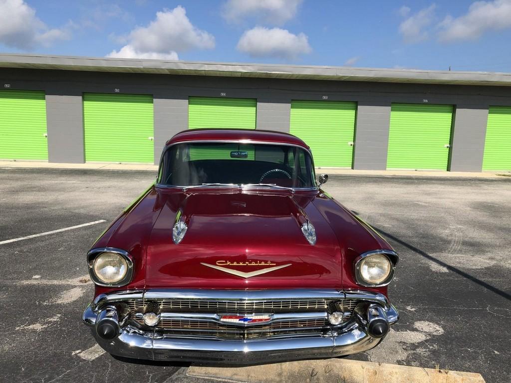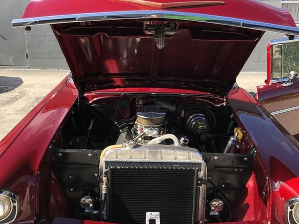 The interior has been updated with leather upholstery and matching carpets. Further additions include an aftermarket steering wheel, a tachometer mounted to the steering column, accessory gauges, a retro-style modern radio, Vintage Air climate control, and a custom center console housing a Hurst shifter.