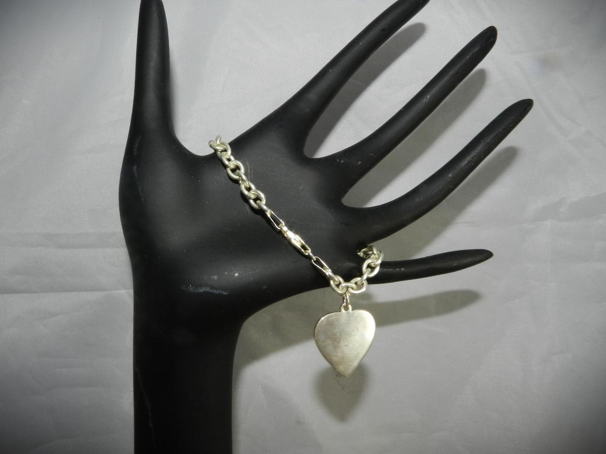 Just in time for Valentine's Day, this lovely vintage link bracelet with a dangling heart charm is tamped Italy 925. It weighs 15.5 grams and has a safety clasp. Engrave the heart or leave it blank.