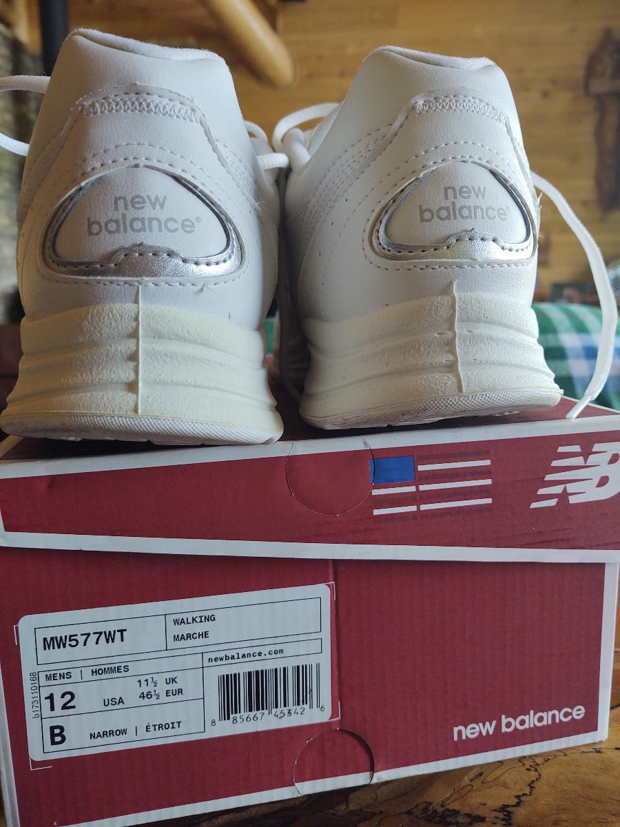 Mens New Balance White Walking Shoes. 12B like new in box. New Balance 577. Used twice to officiate volleyball. Bought for $80. Perfect condition. Call