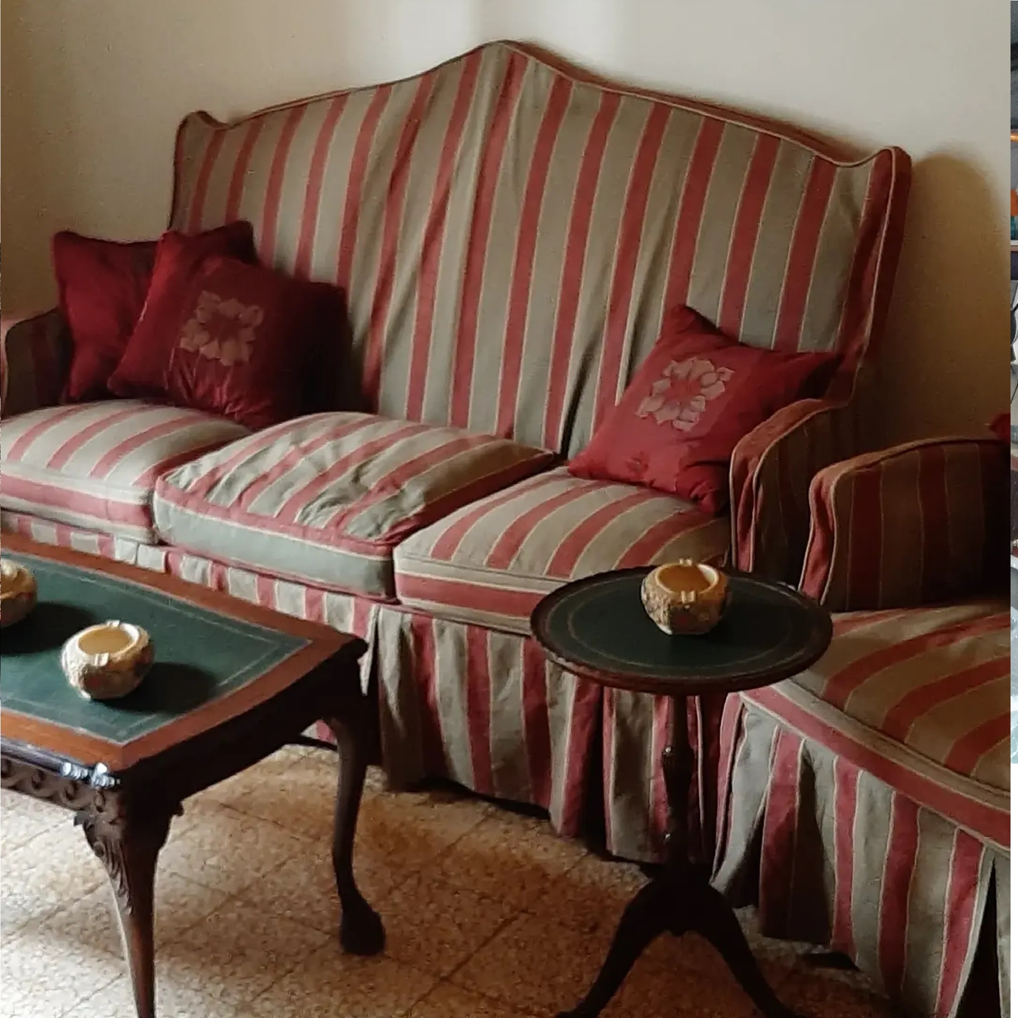 صالون لويس السادس عشر مستعمل حالة جيدة جدا مصنوع تحت الطلب .مؤلف من كنباية 3 مقاعد عدد 1 وفوتايه مقعد واحد عدد 2 .لون ورق الذهب معتق تنجيد جيد جدا .