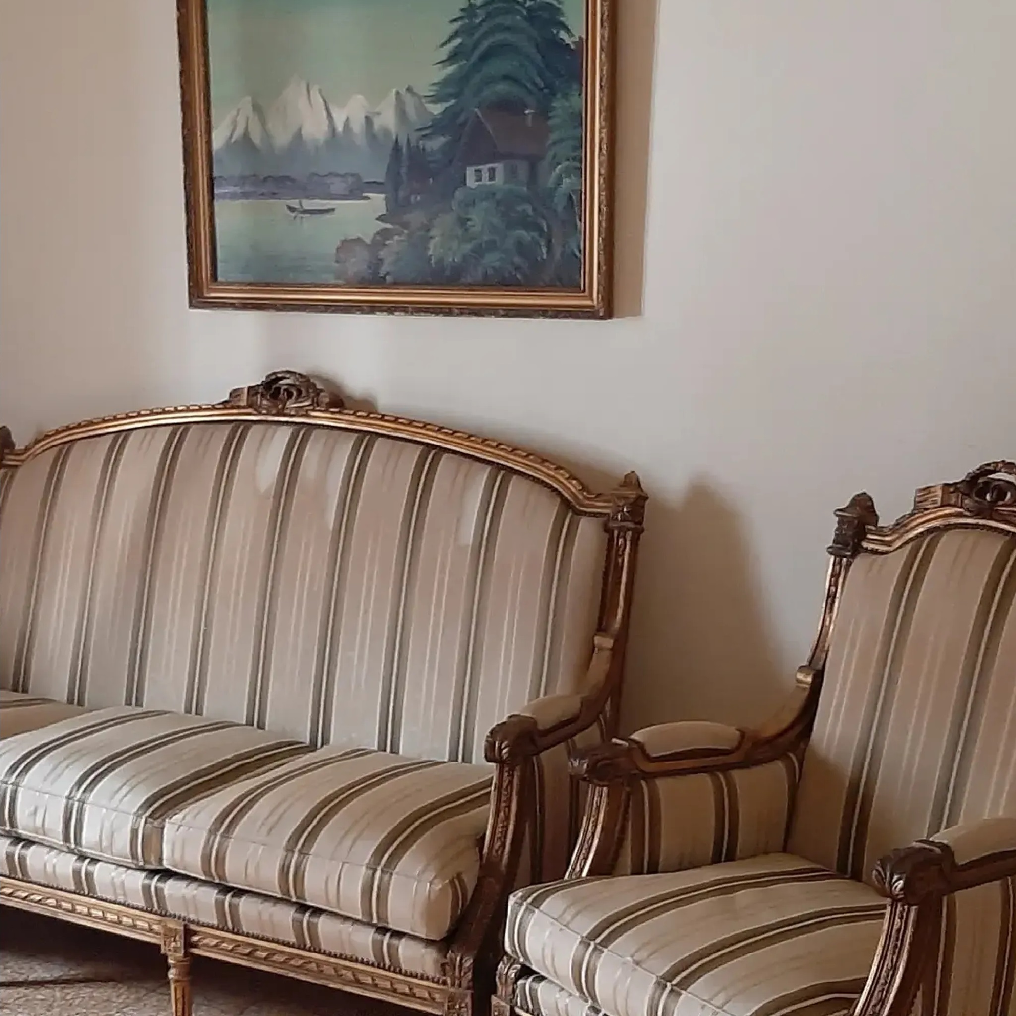 صالون حفر يد موديل لويس السادس عشر مستعمل حالة جيدة 3 قطع . كنباية 3 مقاعد عدد1 و فوتاي مقعد واحد عدد2 .مصنوع عالطلب . تنجيد جيد جدا . الطراحة لحاف ريش نعام