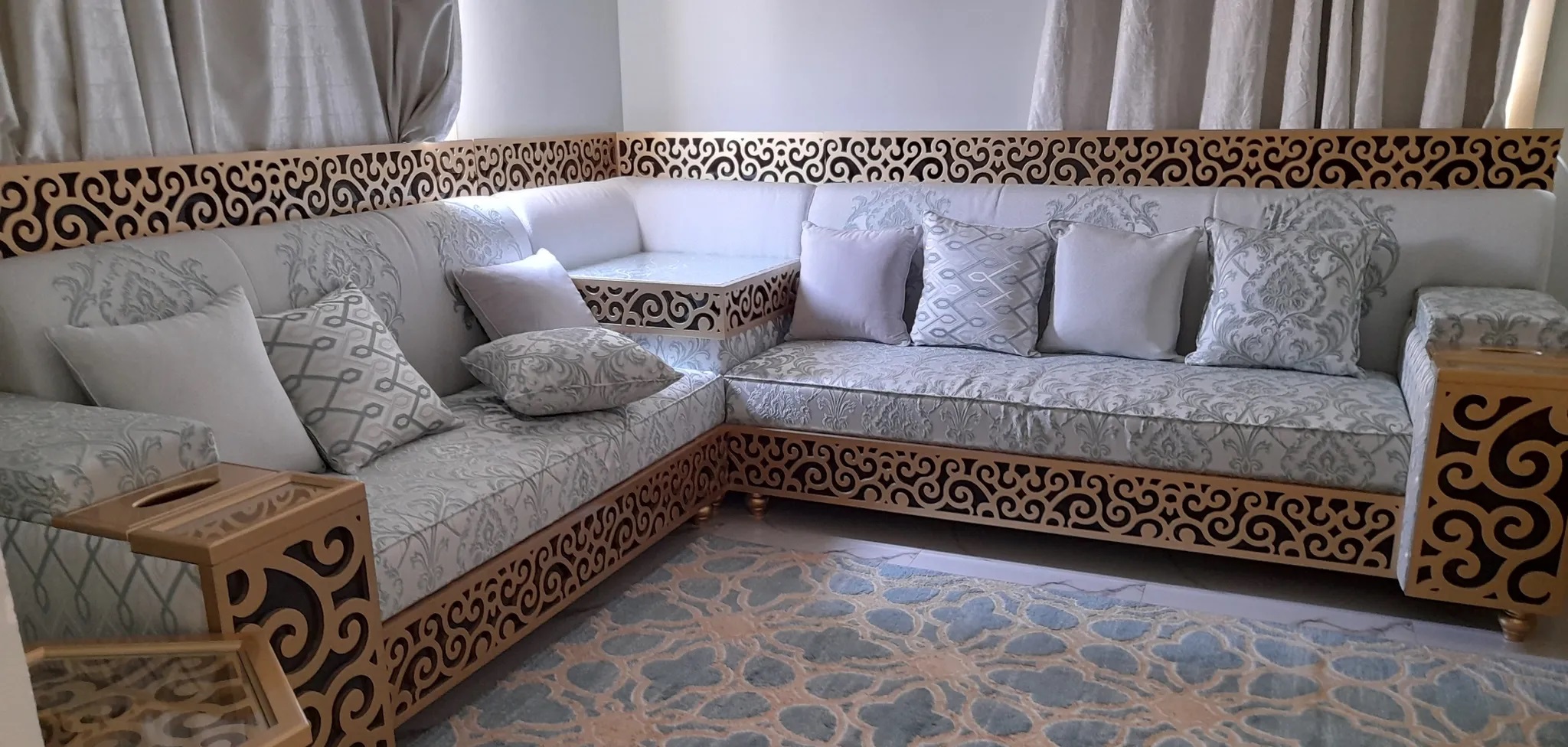 جلسه مغربيه للبيع عبارة عن ثلاث من الكنبات بزاويه على شكل حرف ال بالانقلش ومعها ثلاث طاولات الاثاث جيد جدا واريد بيعه بصورة مستعجله قابل لتفاوض