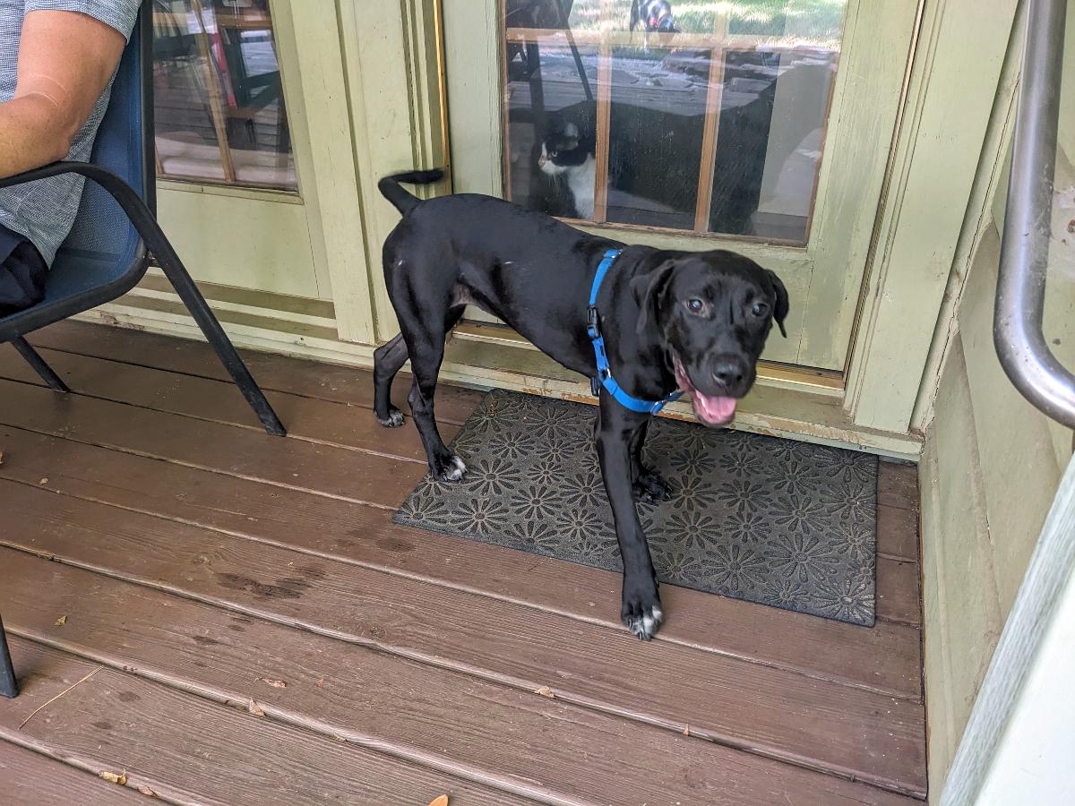 She's only about 6 months old and is a super sweety. Very lovely and good with other dogs. Big cuddler. She's a Great Dane mix and is about 40 pounds now.