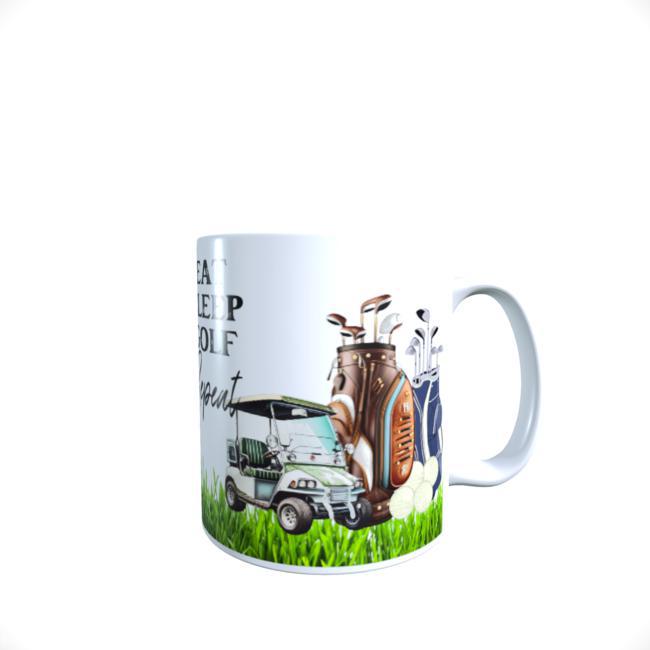 This funny golf mug is the perfect gift for any golfer! It features the text "Eat Sleep Golf Repeat" in a bold font, making it a great way to show your love for the game in a fun and unique way.